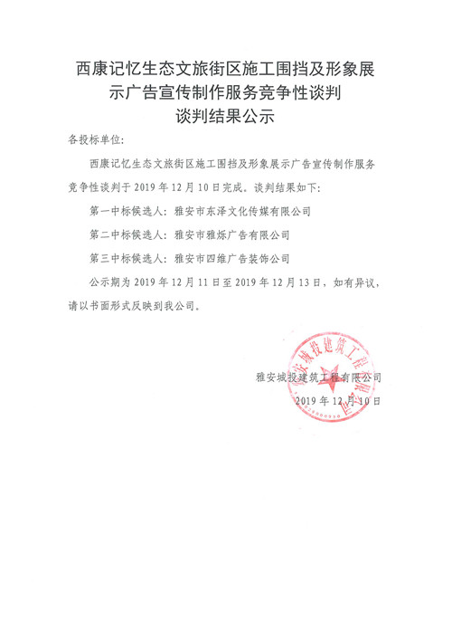 西康記憶生態(tài)文旅街區(qū)施工圍擋及形象展示廣告宣傳制作服務競爭性談判談判結果公示
