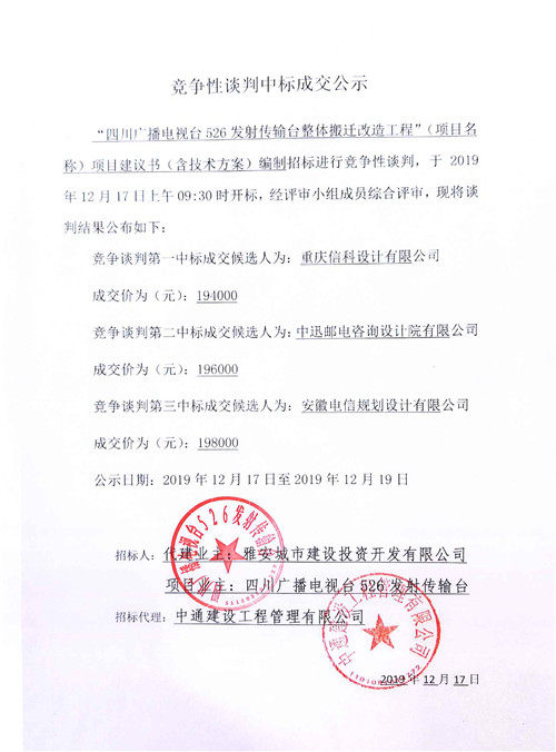 四川廣播電視臺526發(fā)射傳輸臺整體搬遷改造工程項目建議書(含技術(shù)方案)編制招標競爭性談判中標成交公示