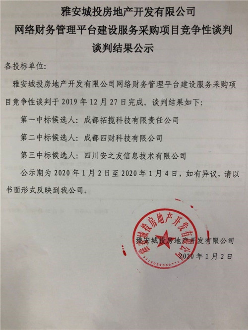 雅安城投房地產(chǎn)開發(fā)有限公司網(wǎng)絡(luò)財務(wù)管理平臺建設(shè)服務(wù)采購項(xiàng)目競爭性談判結(jié)果公司