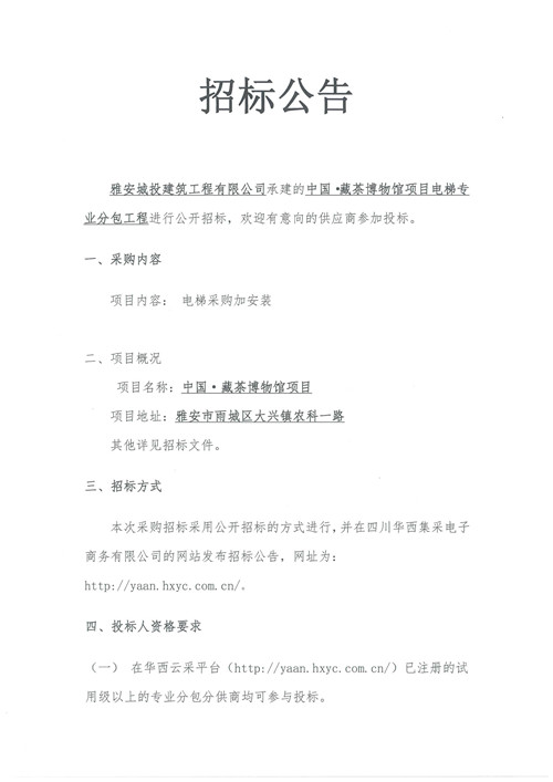 城投建工公司中國·藏茶博物館項(xiàng)目電梯專業(yè)分包工程招標(biāo)公告