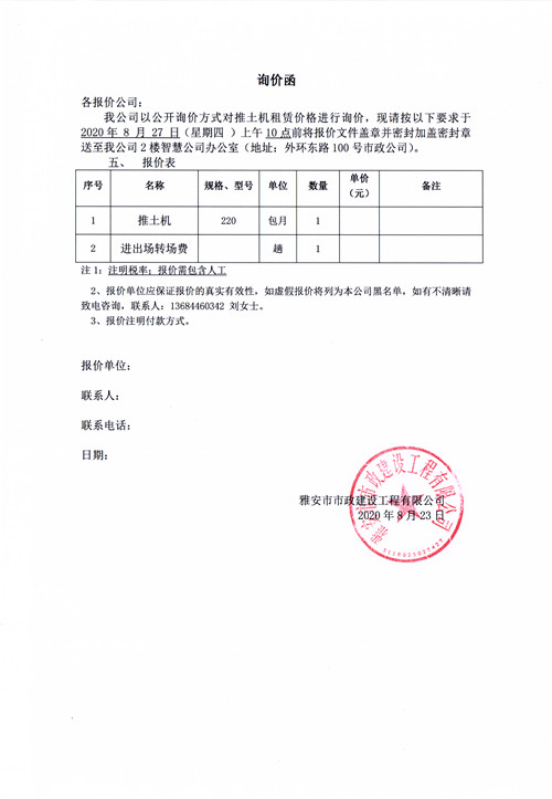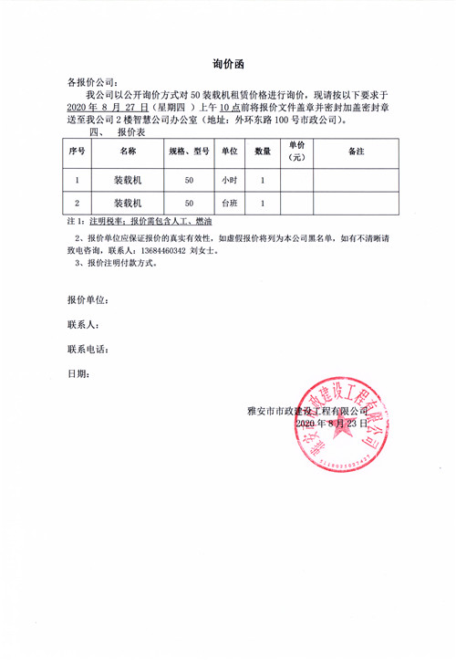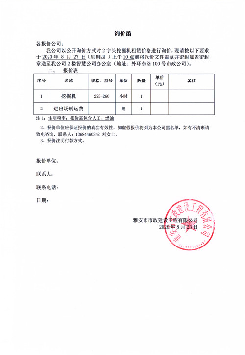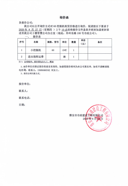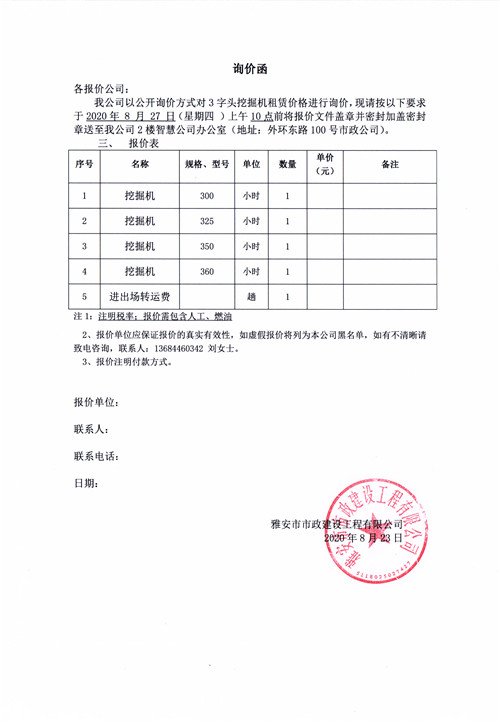 雅安市市政建設(shè)工程有限公司挖掘機(jī)租賃詢價(jià)函