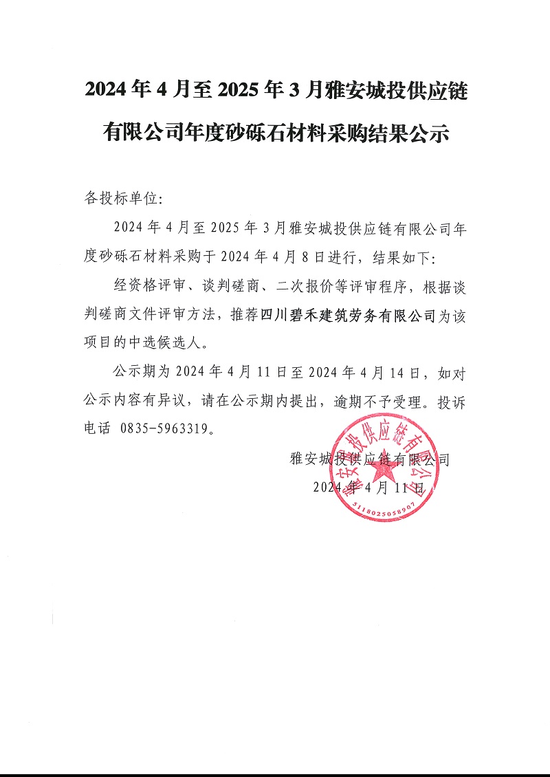 2024年4月至2025年3月雅安城投供應鏈有限公司年度砂礫石材料采購結果公示
