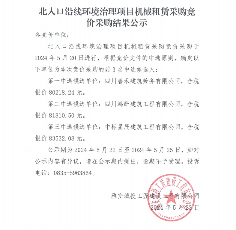 北入口沿線環(huán)境治理項(xiàng)目機(jī)械租賃采購競價(jià)采購結(jié)果公示