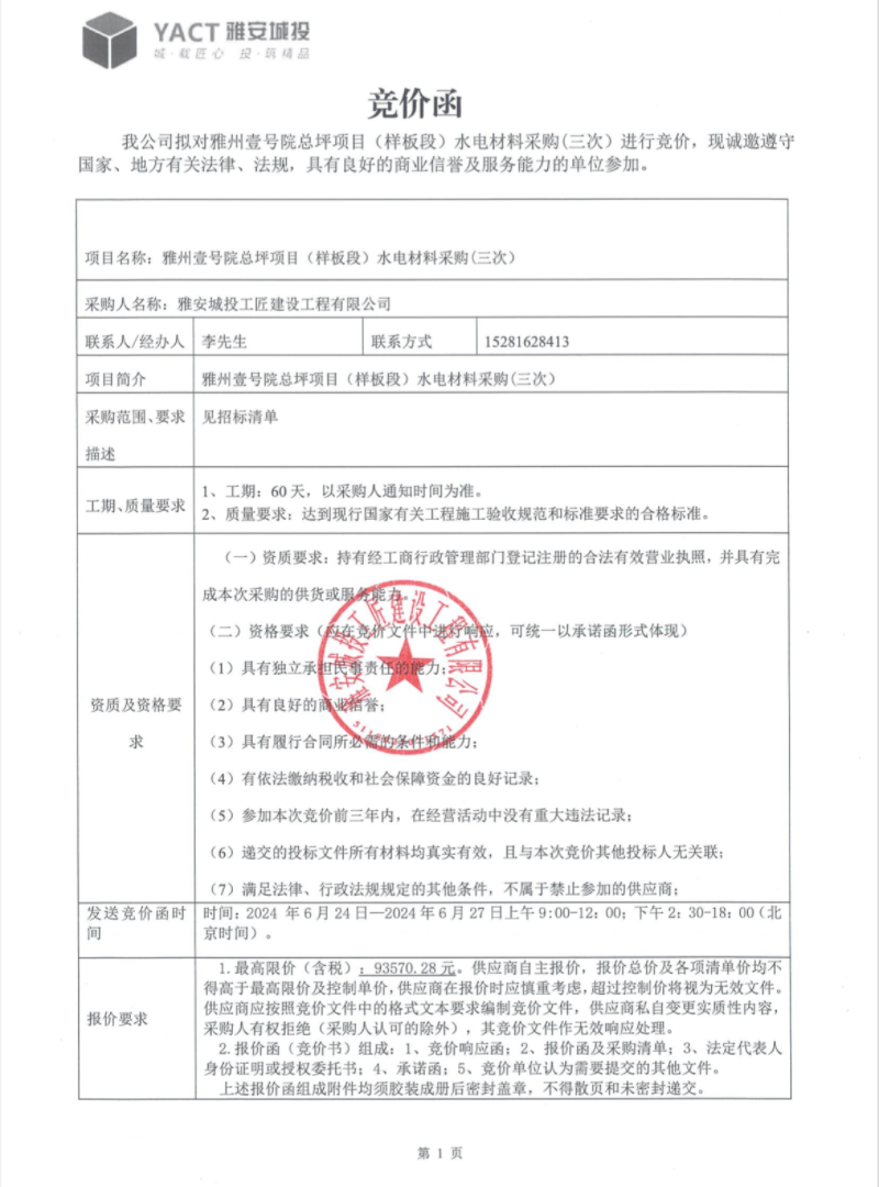 雅州壹號(hào)院總坪項(xiàng)目(樣板段)水電材料采購(gòu)(三次)競(jìng)價(jià)公告