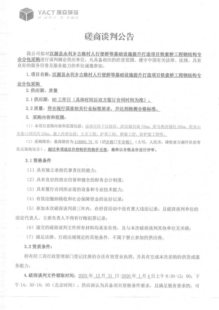 漢源縣永利古路村人行便橋等基礎(chǔ)設(shè)施提升打造項(xiàng)目鐵索橋工程鋼結(jié)構(gòu)專業(yè)分包采購(gòu)磋商談判公告