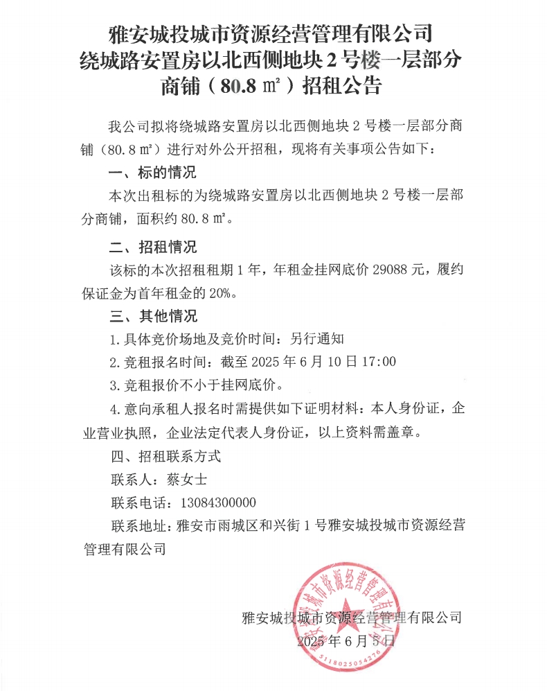 雅安城投城市資源經(jīng)營管理有限公司繞城路安置房以北西側(cè)地塊2號樓一層部分商鋪(80.8m²)招租公告
