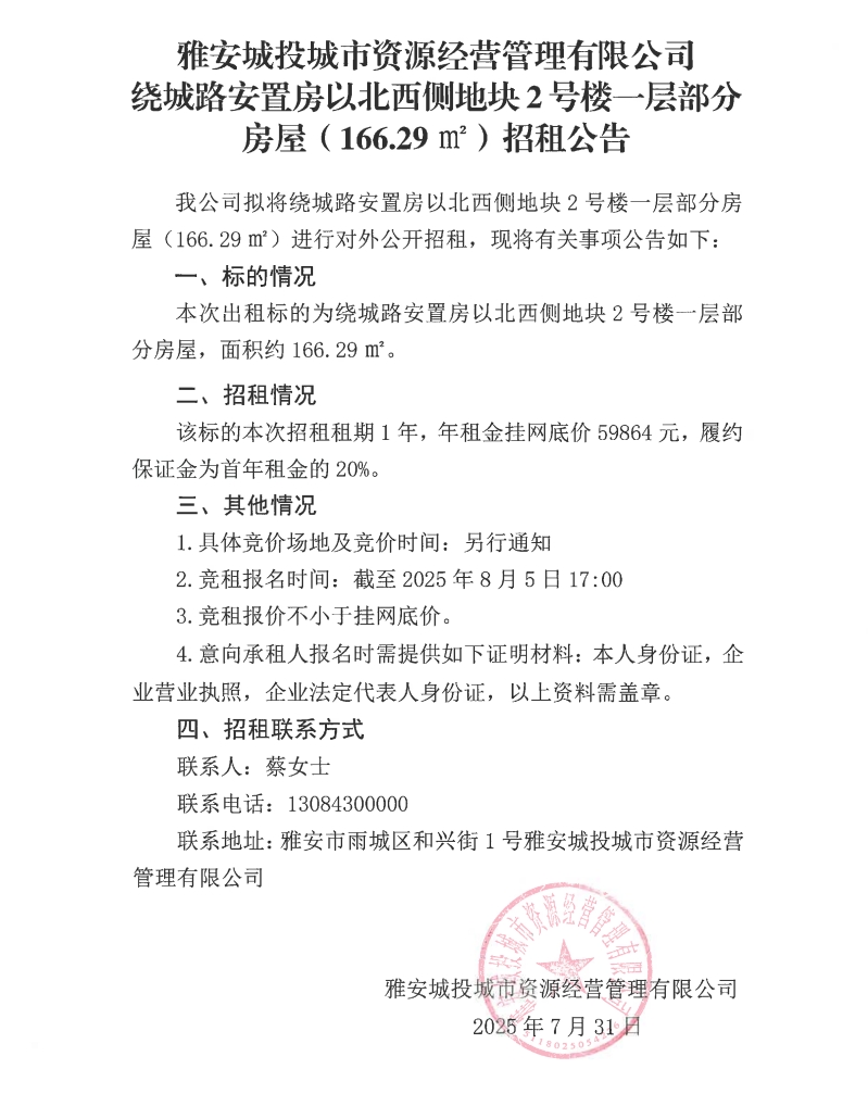 雅安城投城市資源經營管理有限公司繞城路安置房以北西側地塊2號樓一層部分房屋(166.29m²)招租公告